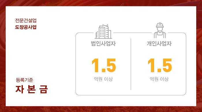 면허 등록을 위해 법인과 개인사업자 모두 1억 5천만원 이상의 자본금을 준비해야 하는데 건설업 영위를 실질자산만 인정이 가능합니다. 법인사업자는 이와 더불어 법인등기부등본상의 납입자본금 또한 1억 5천만원을 충족해야 합니다.